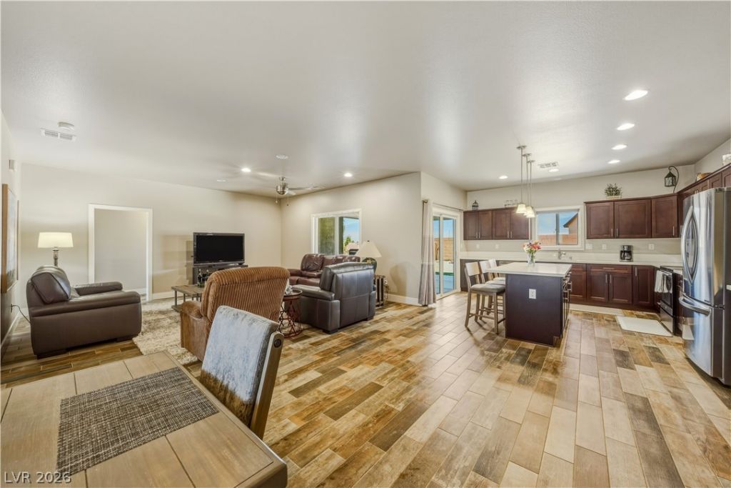 Located in Cottage Grove Estates, this 3 bed, 2 bath home with den offers 1,917 sq ft on a 1/3 acre cul-de-sac lot. Features include 9' ceilings, porcelain tile in main living areas, and a 6' sliding glass door leading to an extended covered patio. The kitchen showcases quartz countertops, pendant and recessed lighting, and two-tone paint. Spacious bedrooms, custom closets, and a tiled primary shower add to the appeal. Exterior highlights include mature desert landscaping, RV parking with hookups, and a oversized 2-car garage. Public water and sewer. Conveniently located near shopping, medical, and commuter routes. Low HOA.